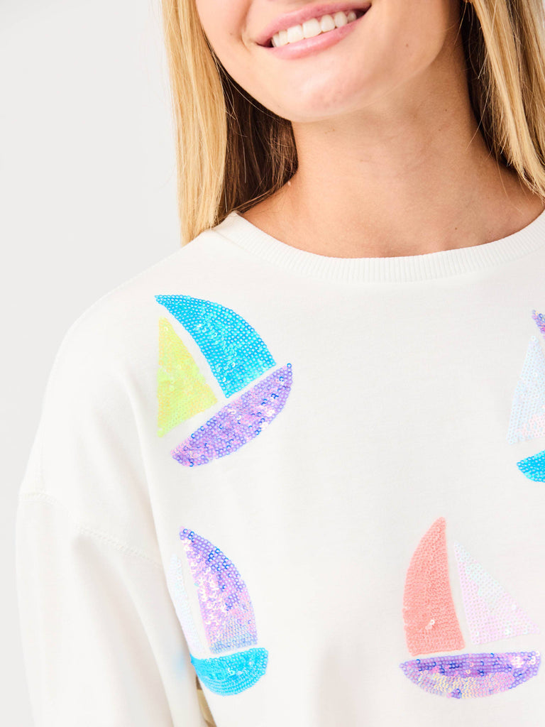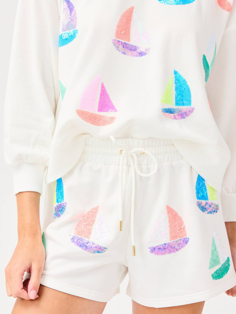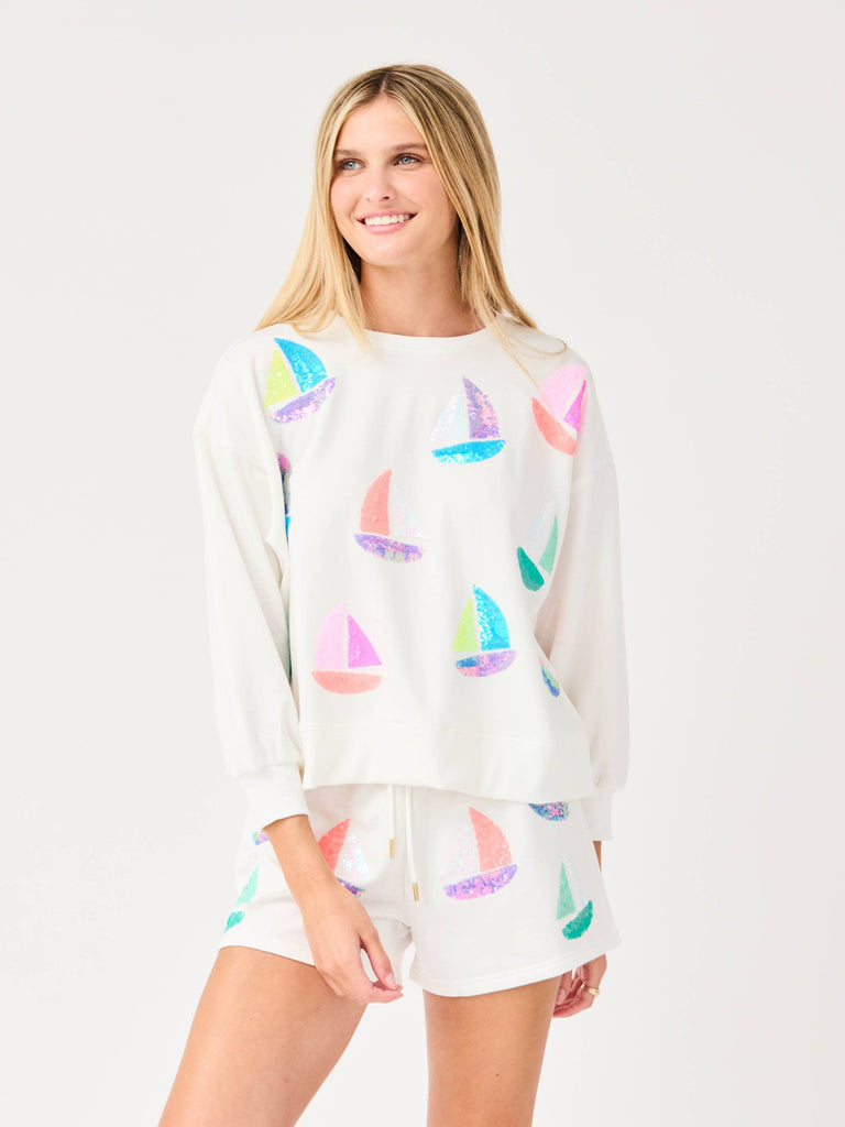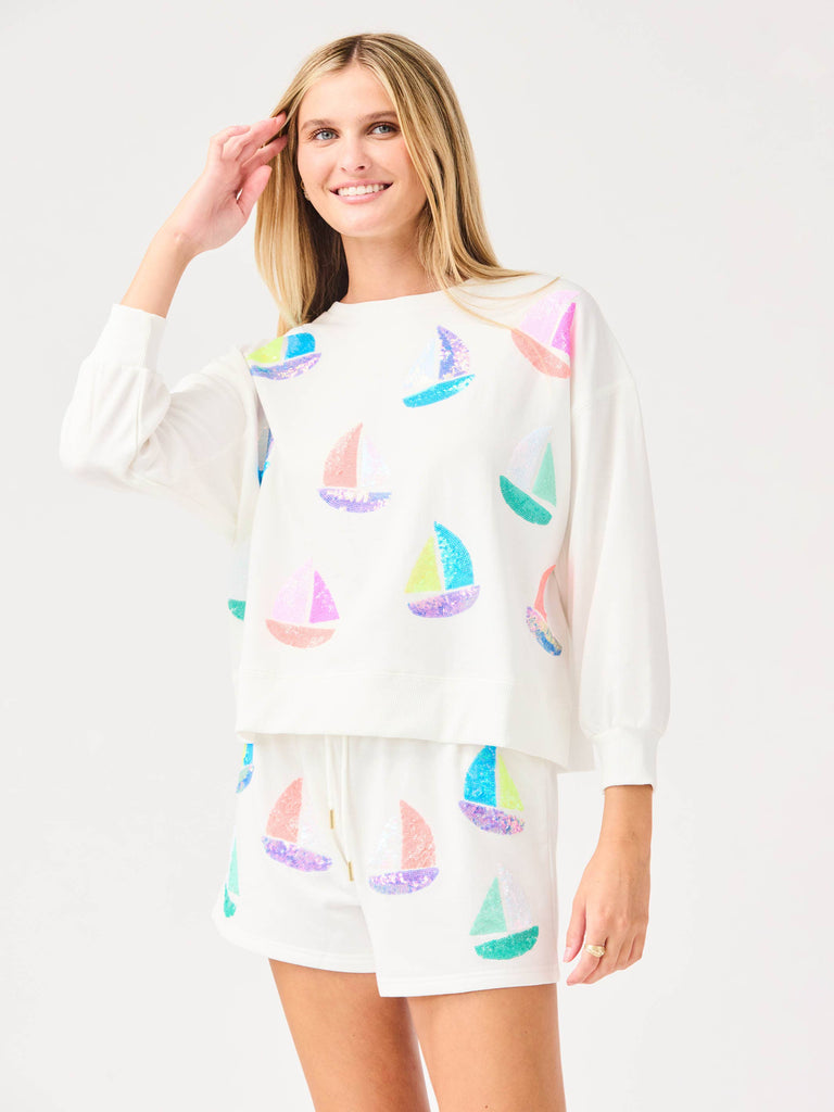 Set sail in style with the Millie Set Featuring sequin embroidered sailboats, this set adds a fun, nautical vibe to your wardrobe. The cropped sweatshirt with full-volume sleeves offers a trendy silhouette, while the relaxed fit and drawstring waistband with gold end caps ensure comfort and ease.